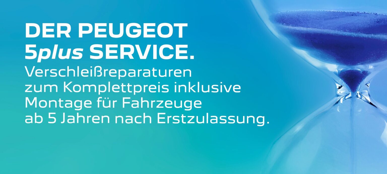 Mit dem PEUGEOT 5plus Service behalten Sie die volle Kostenkontrolle. Für viele PEUGEOT Modelle ab 5 Jahren nach Erstzulassung bieten wir Ihnen damit attraktive Komplettpreise inklusive Montage für wichtige Verschleißreparaturen. So profitieren Sie von Sonderpreisen mit Nachlässen auf Teile und Lohn und Ihr Auto bleibt technisch top in Form.